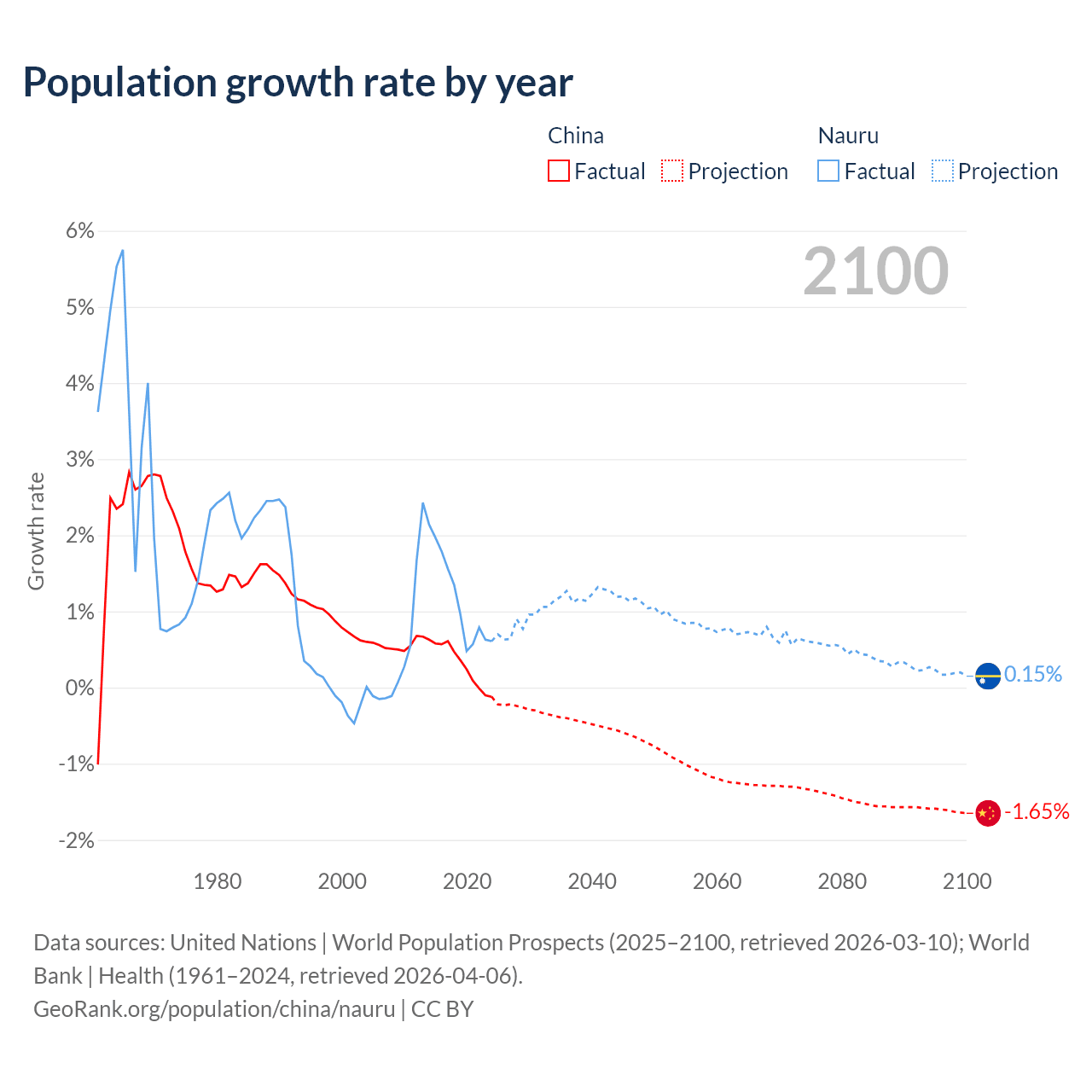 - For the last 10 years, China has had an average growth rate of +0.3% per year vs +1.17% in Nauru.