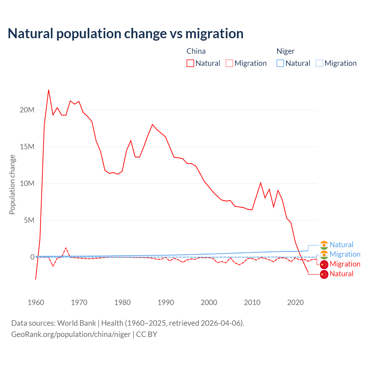 Over the last 10 years, 92.5% of the population change in China is from natural causes (a gain of 42,414,528 people) and 7.53% is from migration (a loss of 3,452,923 people). In Niger 100% is from natural causes (a gain of 7,728,287 people) and 0.03% is from migration (a gain of 2,520 people).