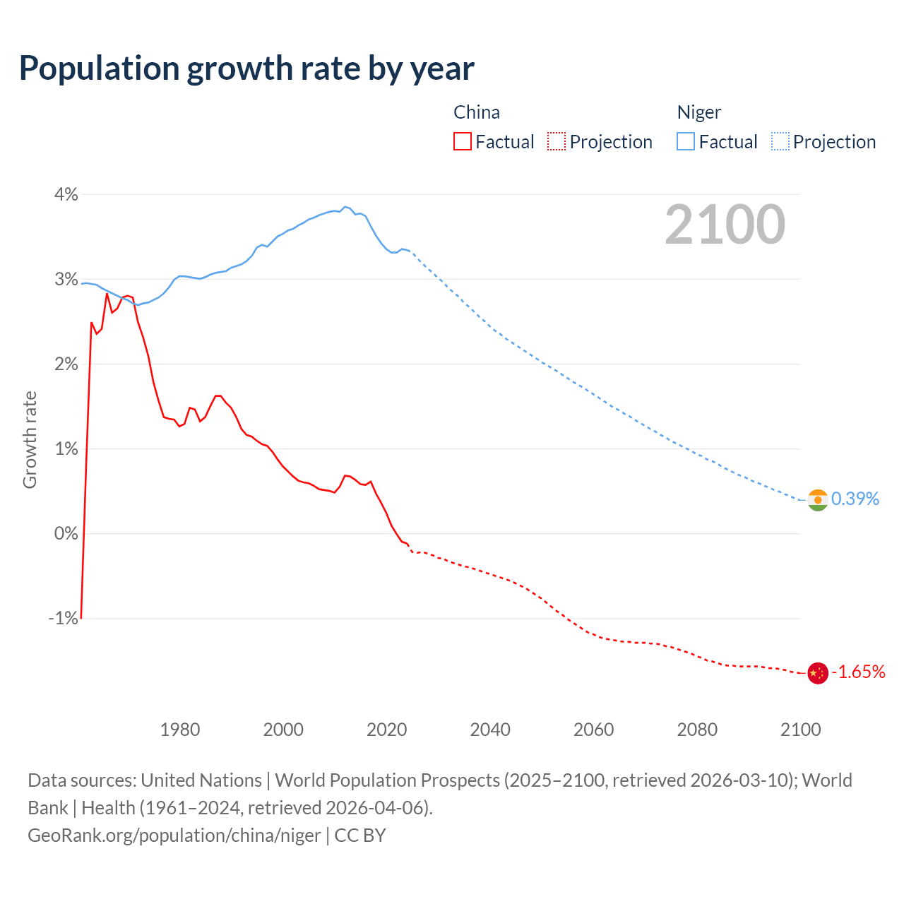 - For the last 10 years, China has had an average growth rate of +0.3% per year vs +3.5% in Niger.