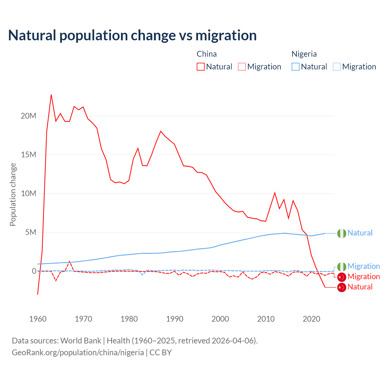 Over the last 10 years, 92.5% of the population change in China is from natural causes (a gain of 42,414,528 people) and 7.53% is from migration (a loss of 3,452,923 people). In Nigeria 99.2% is from natural causes (a gain of 47,163,517 people) and 0.77% is from migration (a loss of 368,103 people).