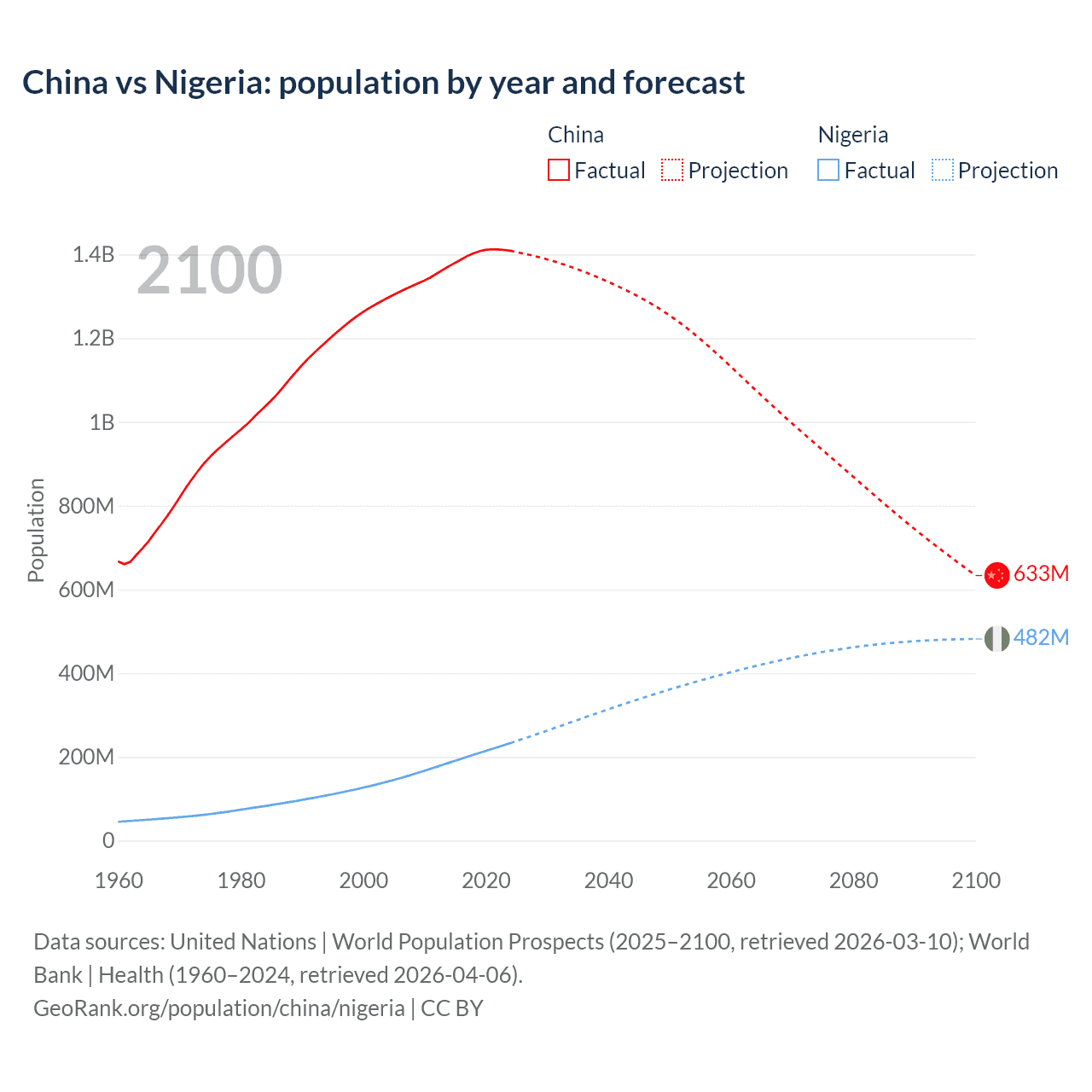 China vs Nigeria: population by year and forecast