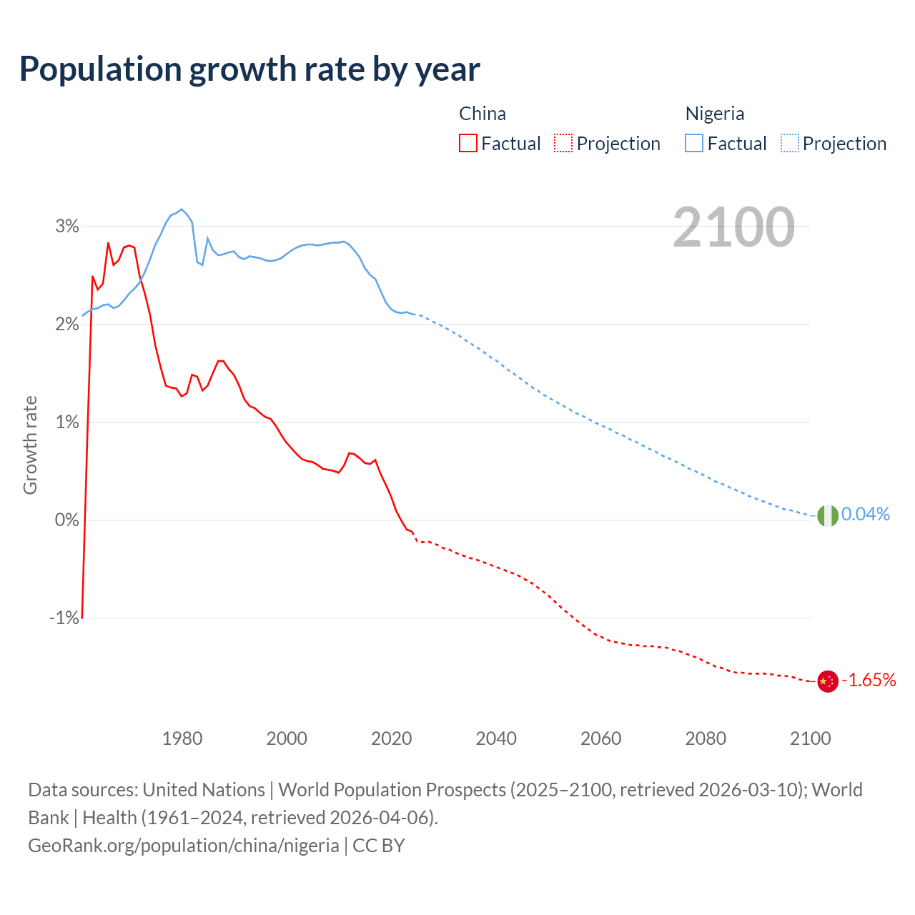 Data sources: World Bank | Health (1960–2024, retrieved 2026-04-06); United Nations | World Population Prospects (1960–2026, retrieved 2026-03-10); U.S. Census Bureau (1960–2025, retrieved 2026-02-08); Central Intelligence Agency (CIA) (2000–2019, retrieved 2026-02-20).