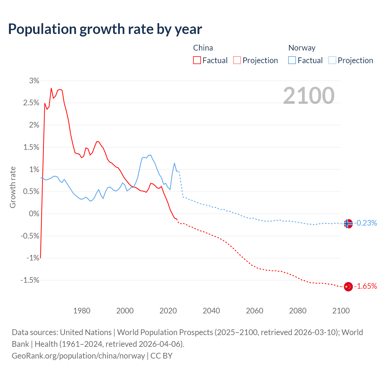 - For the last 10 years, China has had an average growth rate of +0.3% per year vs +0.85% in Norway.