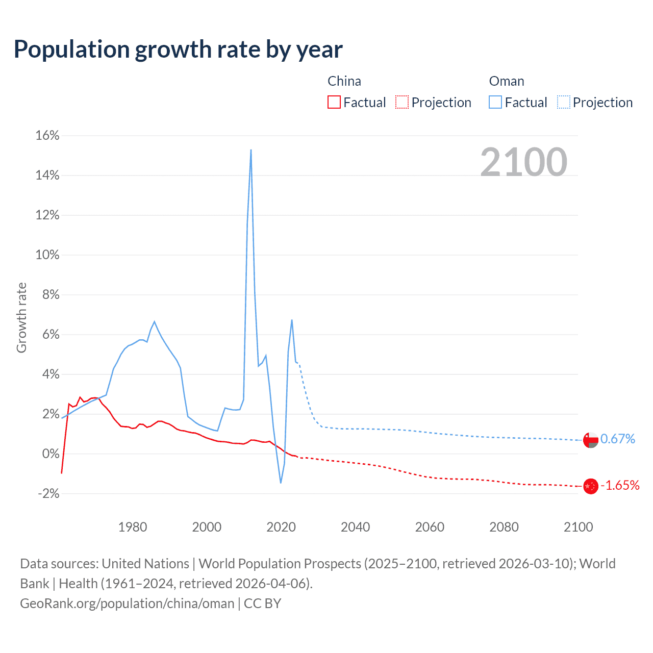 - For the last 10 years, China has had an average growth rate of +0.3% per year vs +2.99% in Oman.