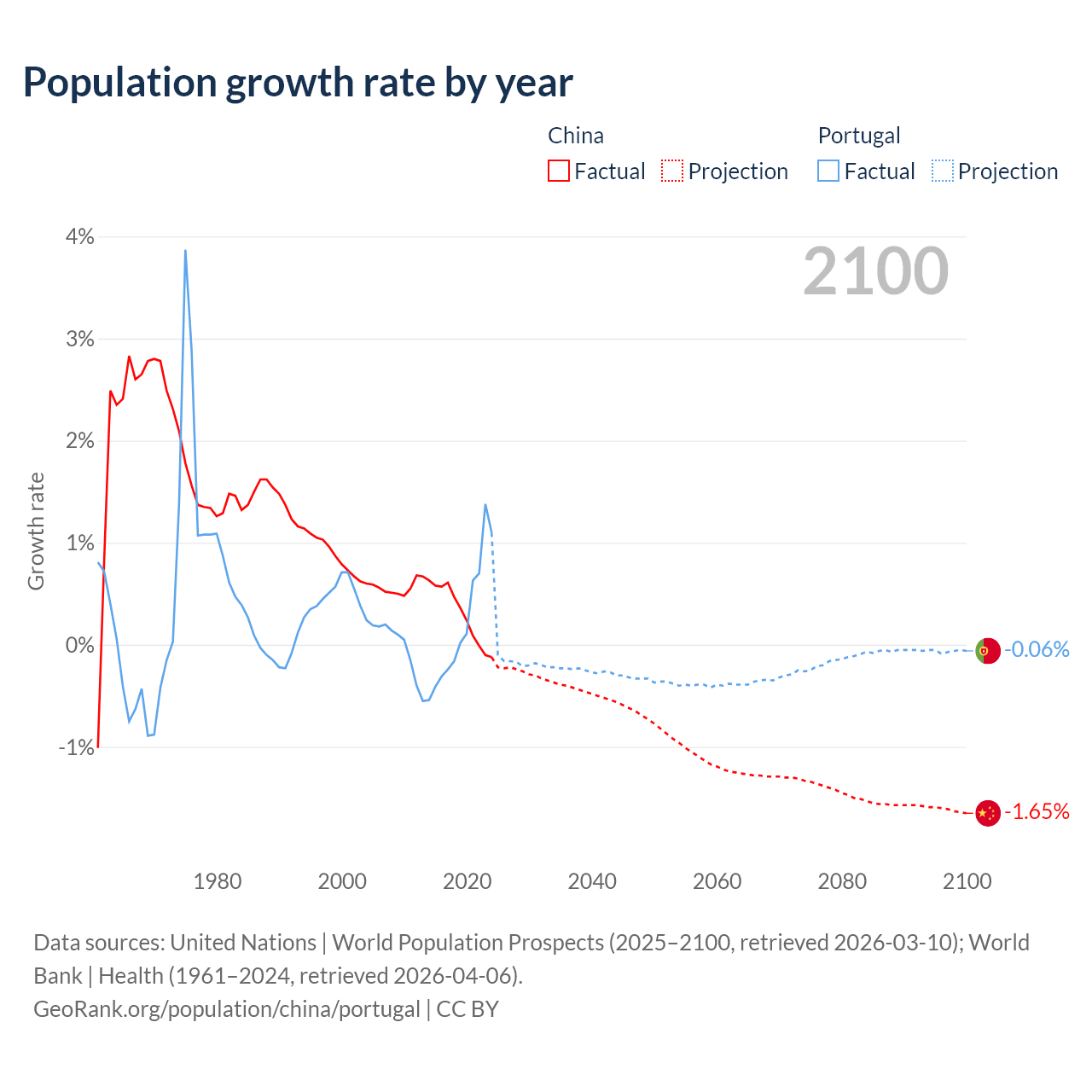 Data sources: World Bank | Health (1960–2024, retrieved 2026-04-06); United Nations | World Population Prospects (1960–2026, retrieved 2026-03-10); U.S. Census Bureau (1960–2025, retrieved 2026-02-08); Central Intelligence Agency (CIA) (2000–2019, retrieved 2026-02-20).