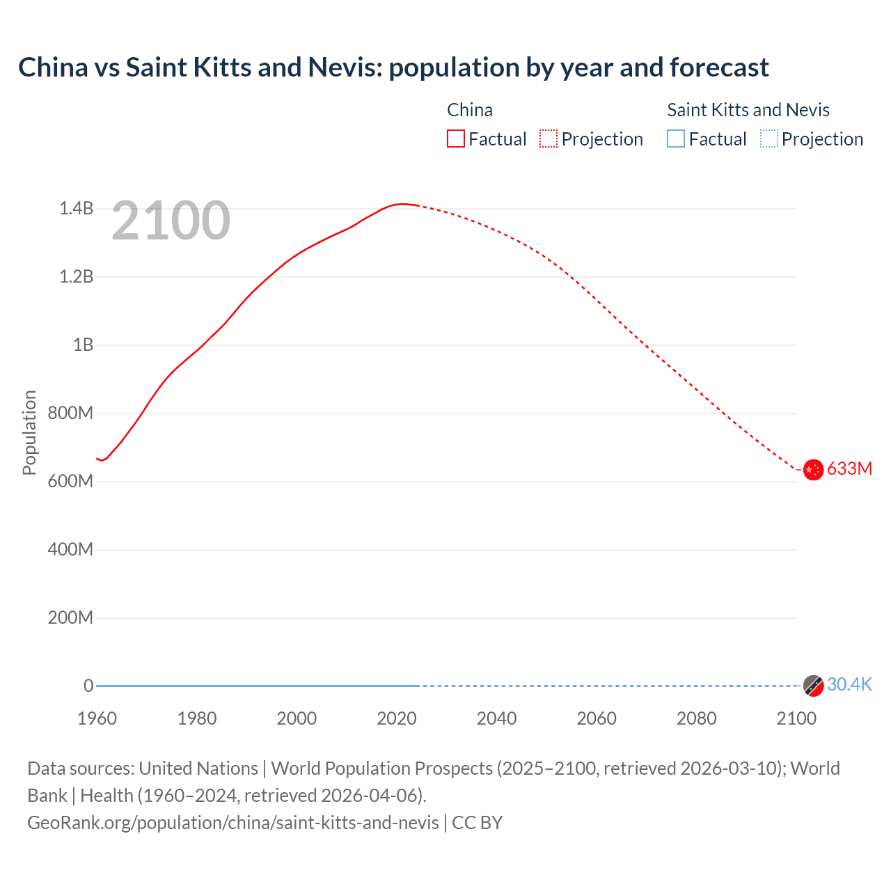 China vs Saint Kitts and Nevis: population by year and forecast