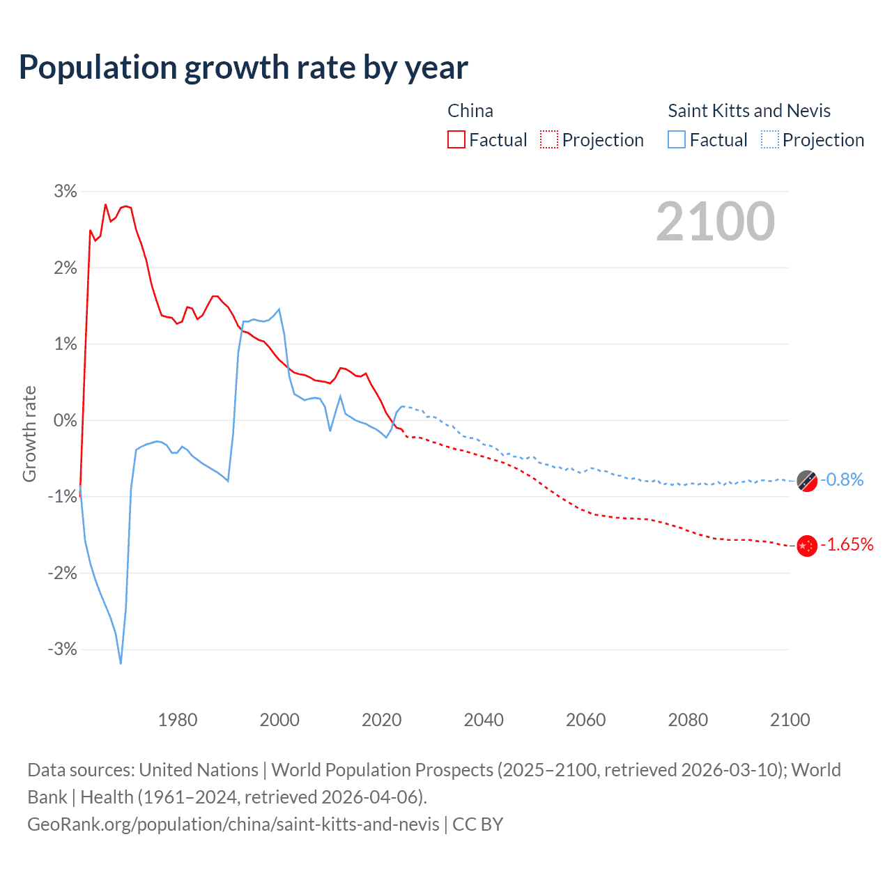 - For the last 10 years, China has had an average growth rate of +0.3% per year vs -0.04% in Saint Kitts and Nevis.