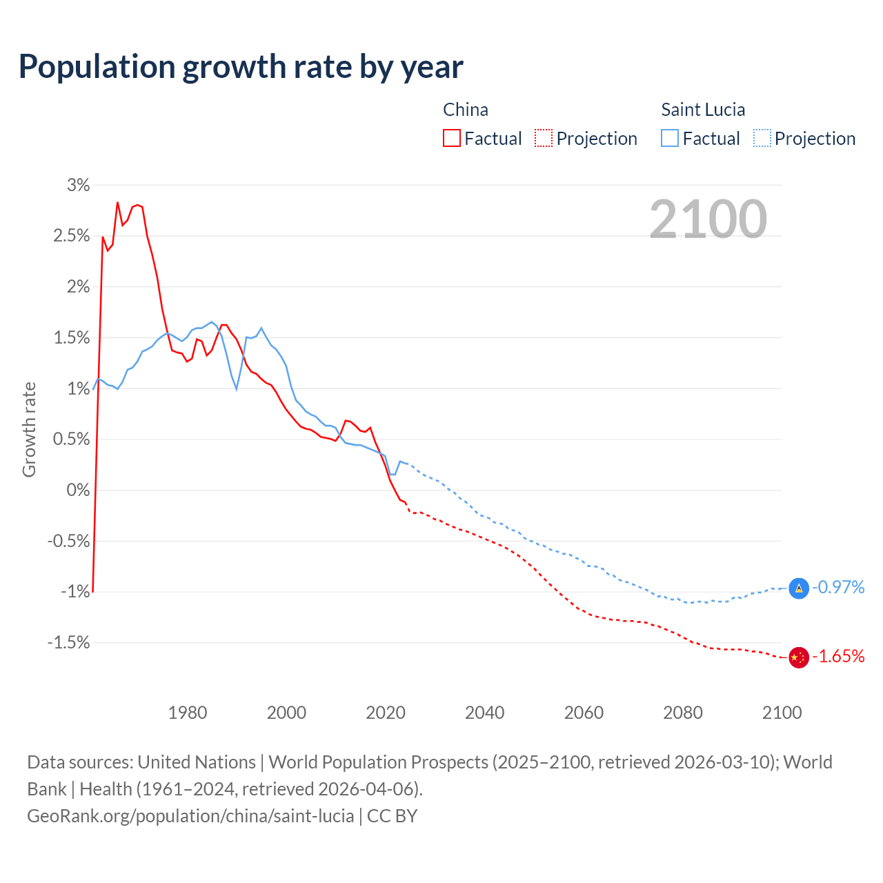- For the last 10 years, China has had an average growth rate of +0.3% per year vs +0.33% in Saint Lucia.