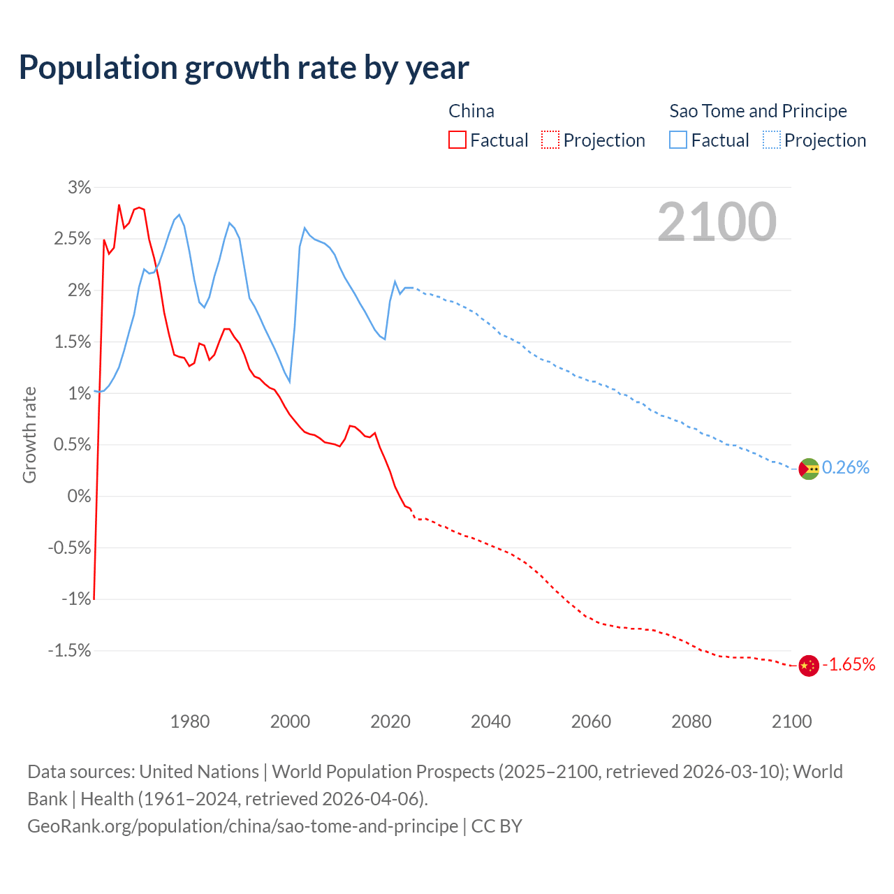 - For the last 10 years, China has had an average growth rate of +0.3% per year vs +1.82% in Sao Tome and Principe.