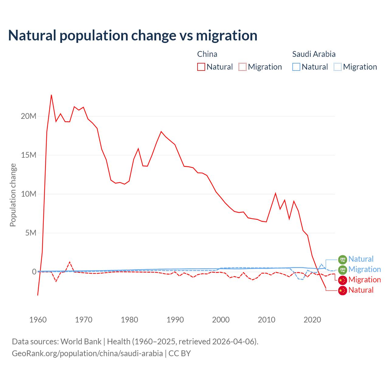 Over the last 10 years, 92.5% of the population change in China is from natural causes (a gain of 42,414,528 people) and 7.53% is from migration (a loss of 3,452,923 people). In Saudi Arabia 93.9% is from natural causes (a gain of 4,829,562 people) and 6.05% is from migration (a gain of 311,209 people).