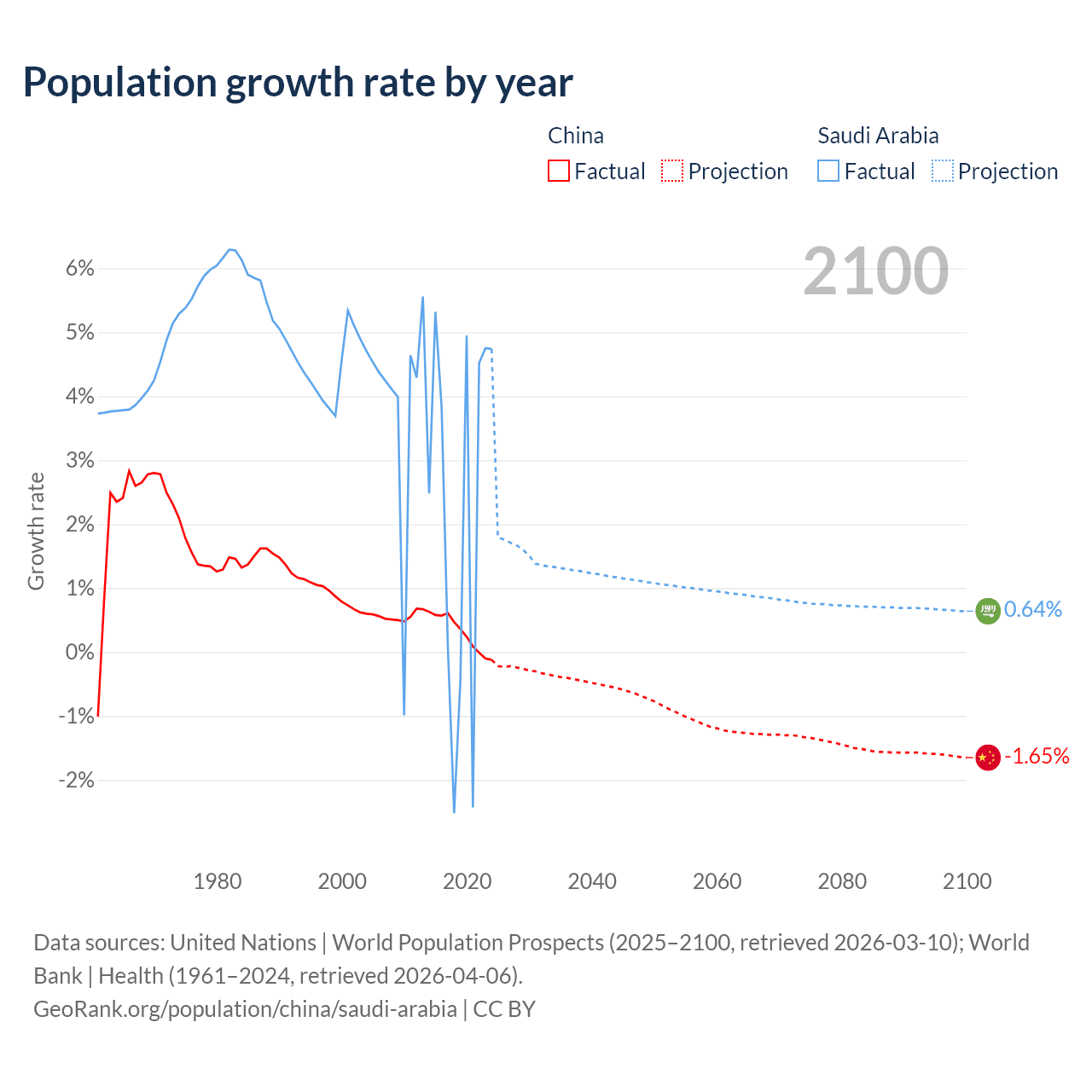 - For the last 10 years, China has had an average growth rate of +0.3% per year vs +2.3% in Saudi Arabia.