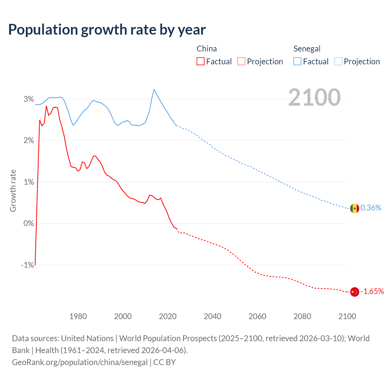- For the last 10 years, China has had an average growth rate of +0.3% per year vs +2.76% in Senegal.