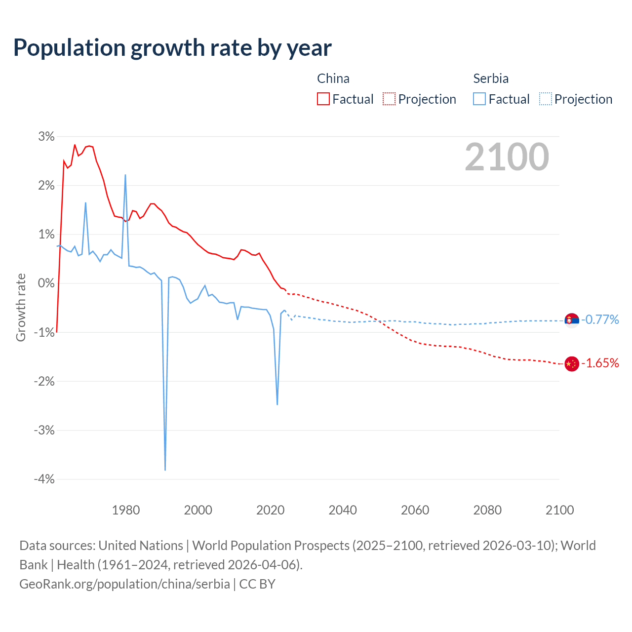 - For the last 10 years, China has had an average growth rate of +0.3% per year vs -0.76% in Serbia.