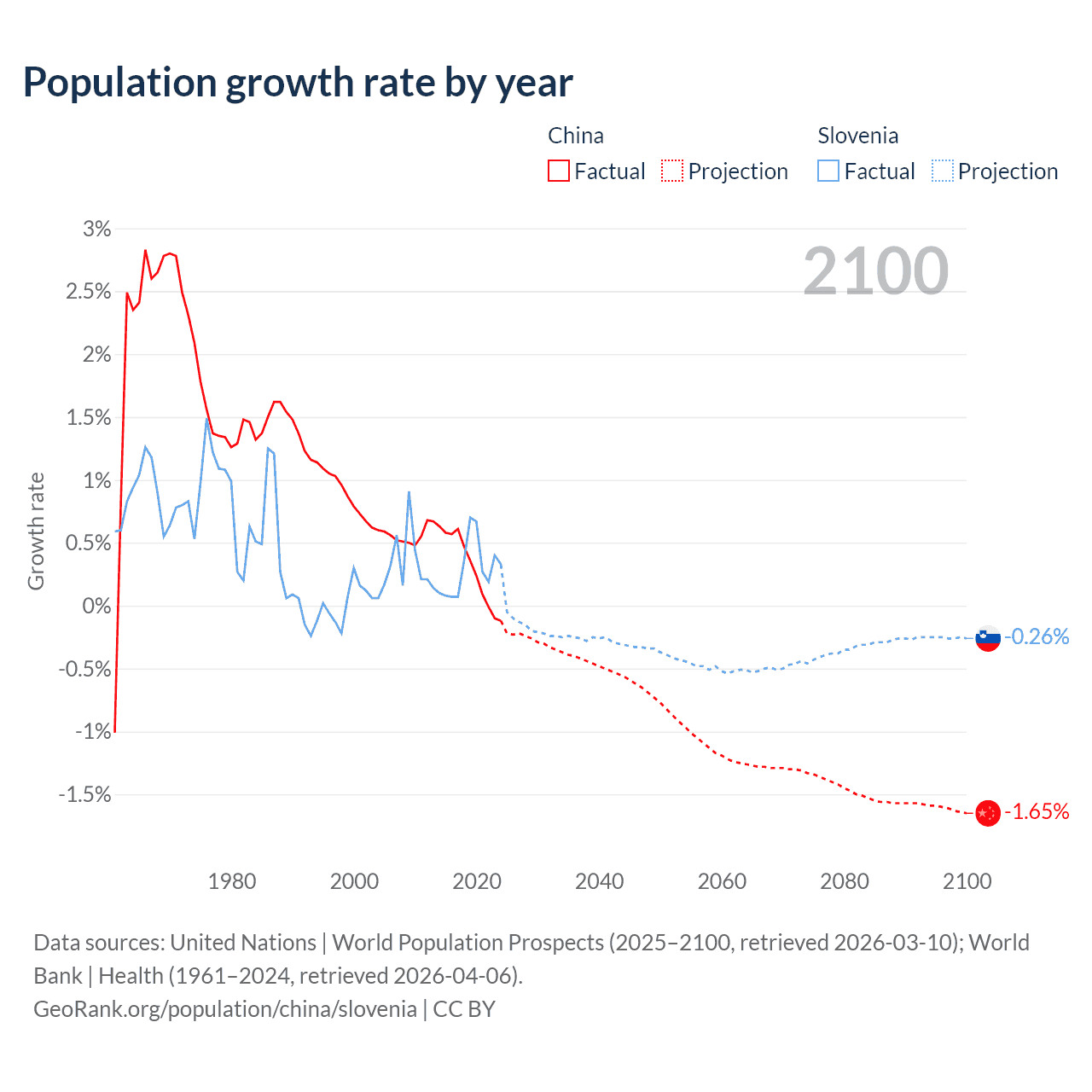 - For the last 10 years, China has had an average growth rate of +0.3% per year vs +0.29% in Slovenia.