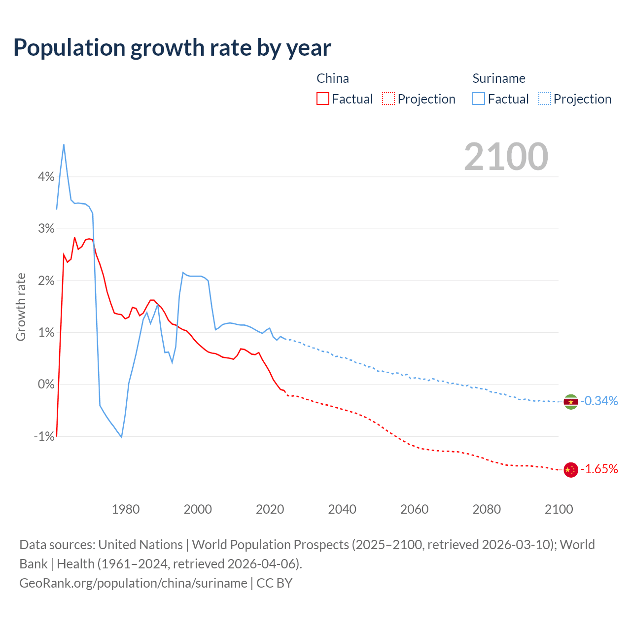 - For the last 10 years, China has had an average growth rate of +0.3% per year vs +0.99% in Suriname.