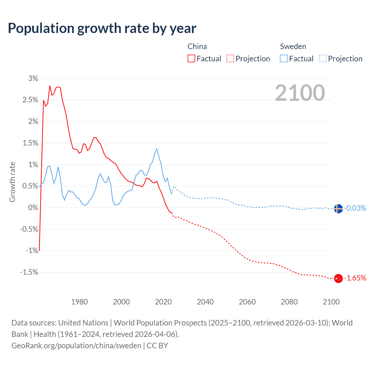 Data sources: World Bank | Health (1960–2024, retrieved 2026-04-06); United Nations | World Population Prospects (1960–2026, retrieved 2026-03-10); U.S. Census Bureau (1960–2025, retrieved 2026-02-08); Central Intelligence Agency (CIA) (2000–2019, retrieved 2026-02-20).