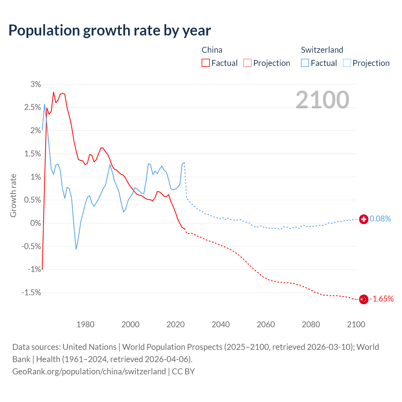 - For the last 10 years, China has had an average growth rate of +0.3% per year vs +0.98% in Switzerland.