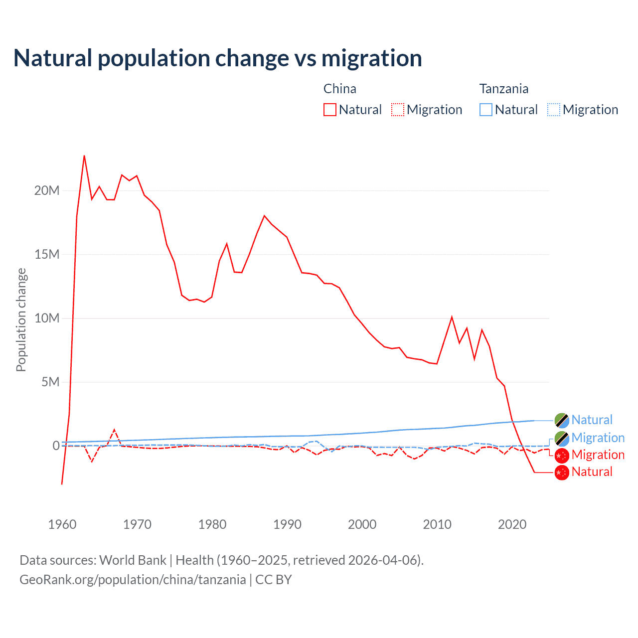 Over the last 10 years, 92.5% of the population change in China is from natural causes (a gain of 42,414,528 people) and 7.53% is from migration (a loss of 3,452,923 people). In Tanzania 98.7% is from natural causes (a gain of 17,769,541 people) and 1.27% is from migration (a gain of 229,466 people).