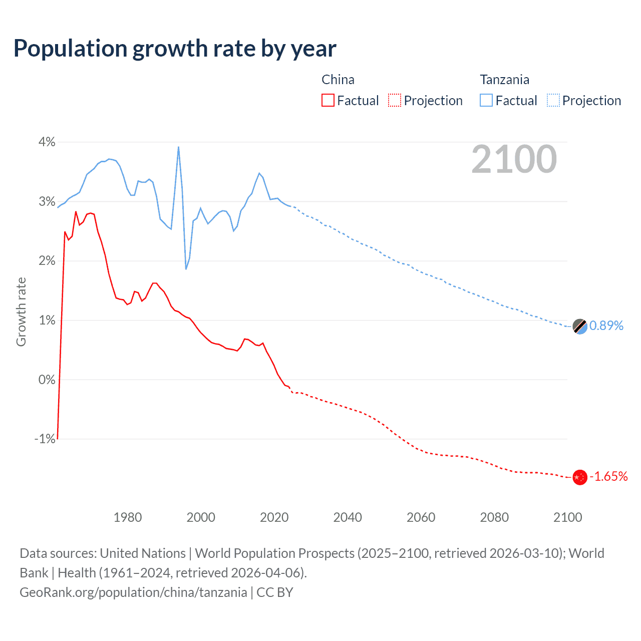 - For the last 10 years, China has had an average growth rate of +0.3% per year vs +3.13% in Tanzania.