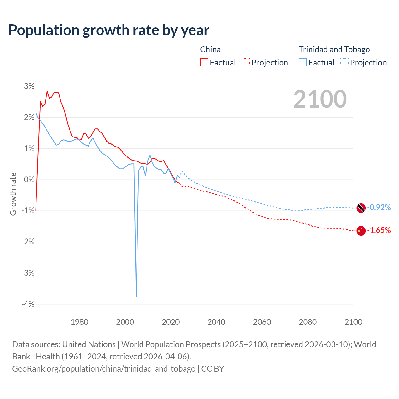 - For the last 10 years, China has had an average growth rate of +0.3% per year vs +0.19% in Trinidad and Tobago.