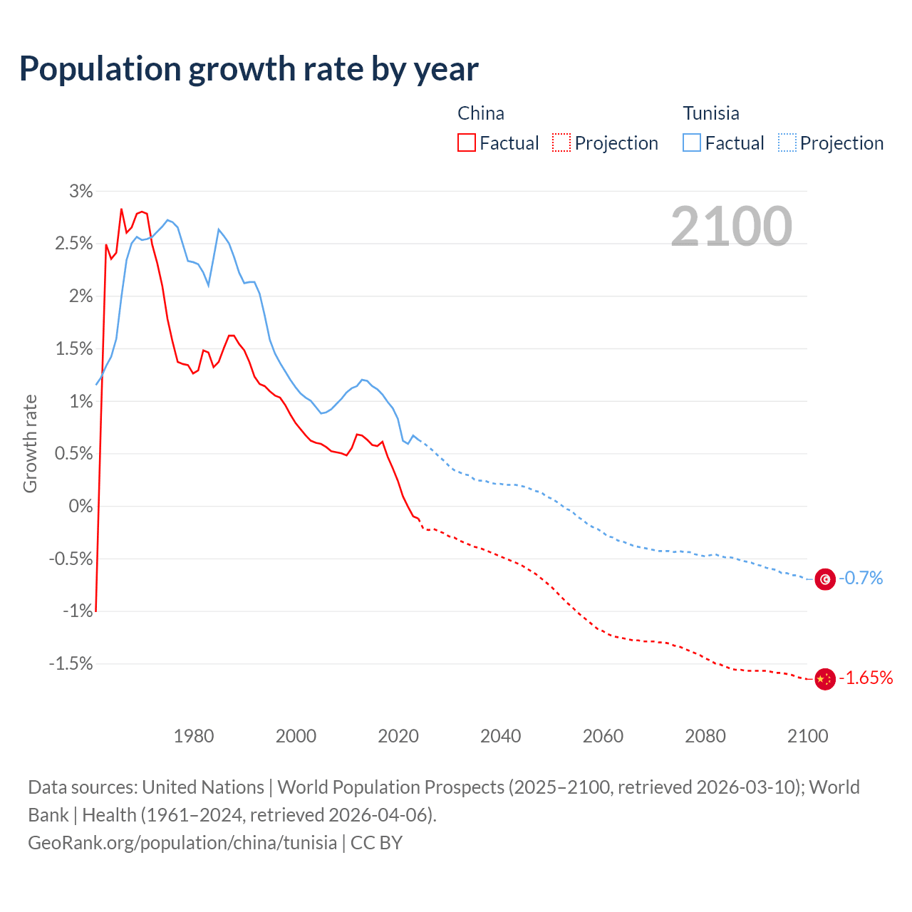 - For the last 10 years, China has had an average growth rate of +0.3% per year vs +0.89% in Tunisia.