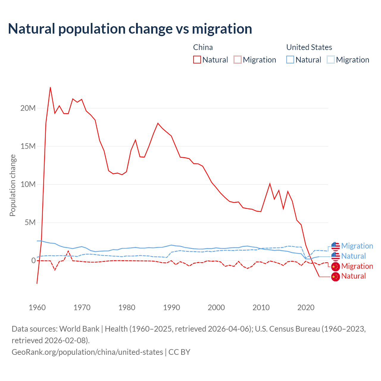 Data sources: World Bank | Health (1960–2025, retrieved 2026-04-06); U.S. Census Bureau (1960–2023, retrieved 2026-02-08).