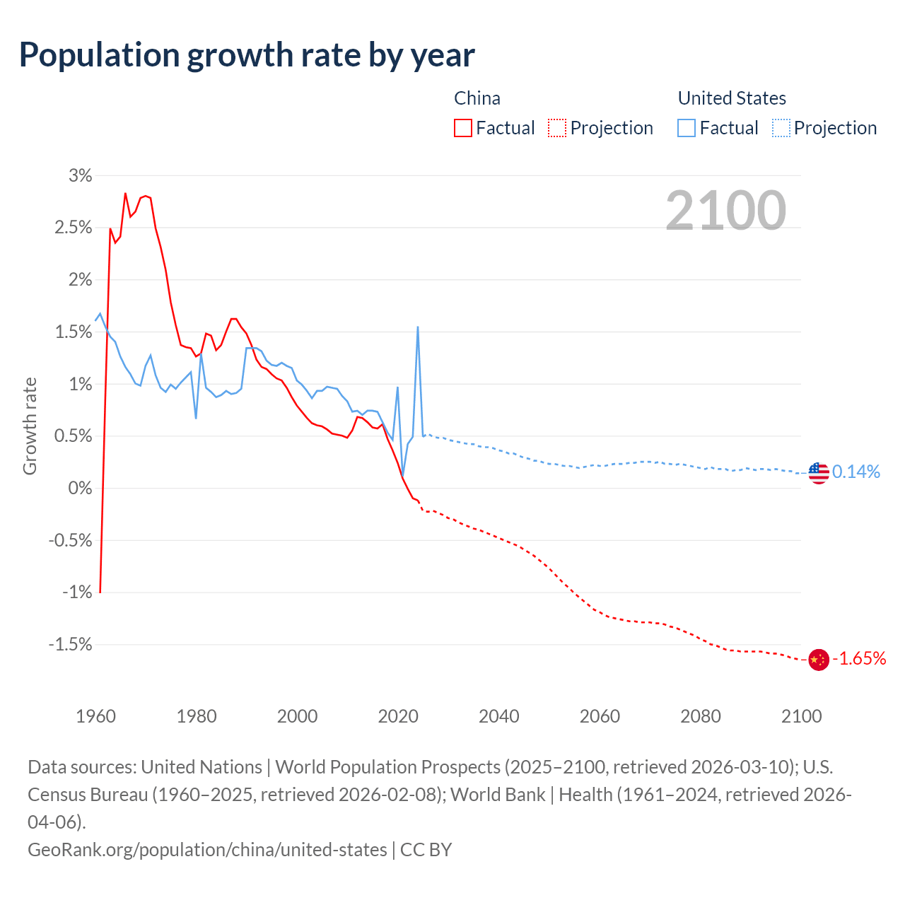 Data sources: World Bank | Health (1960–2024, retrieved 2026-04-06); United Nations | World Population Prospects (1960–2026, retrieved 2026-03-10); U.S. Census Bureau (1960–2025, retrieved 2026-02-08); Central Intelligence Agency (CIA) (2000–2019, retrieved 2026-02-20).