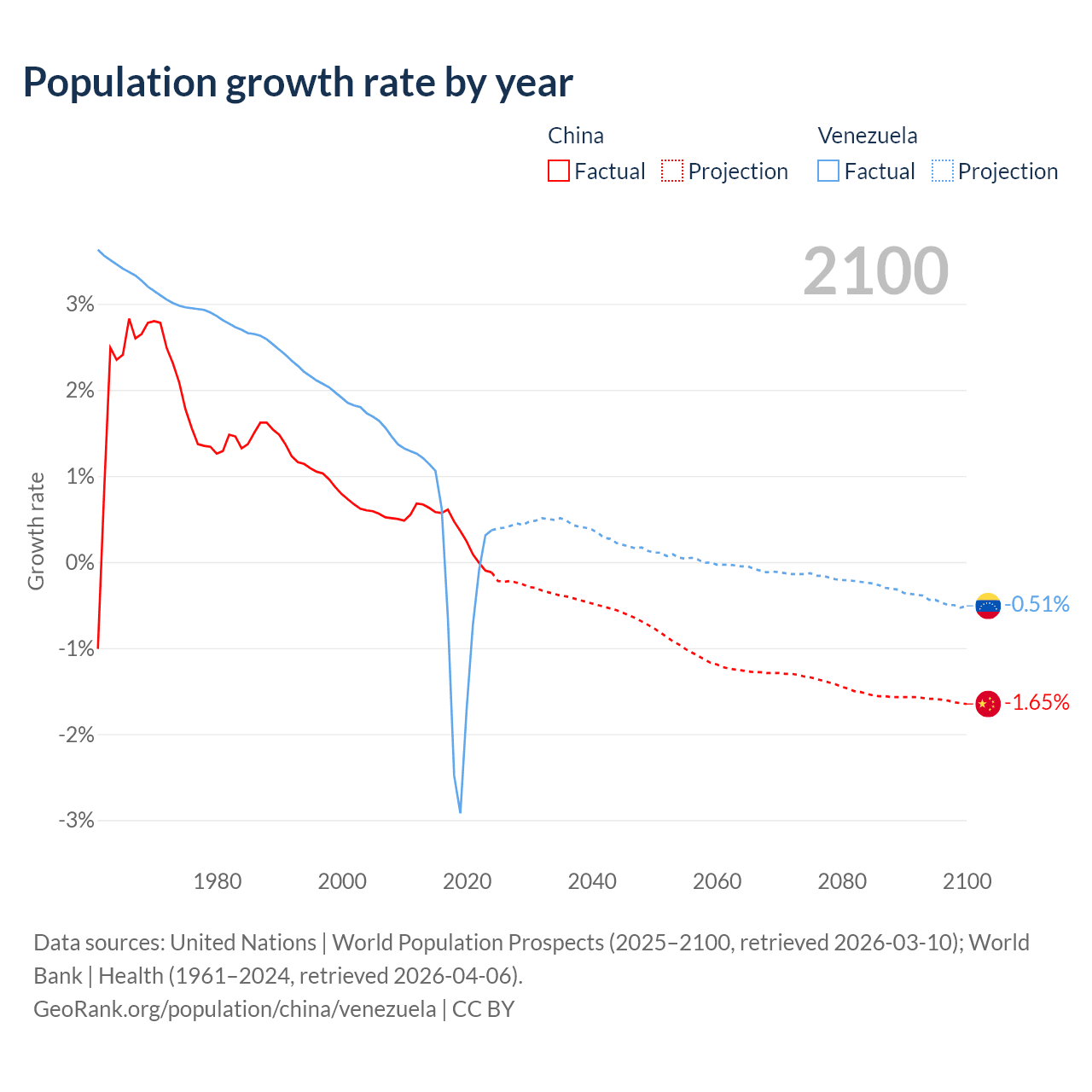 - For the last 10 years, China has had an average growth rate of +0.3% per year vs -0.46% in Venezuela.