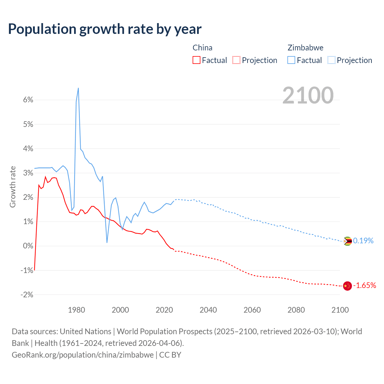 - For the last 10 years, China has had an average growth rate of +0.3% per year vs +1.57% in Zimbabwe.