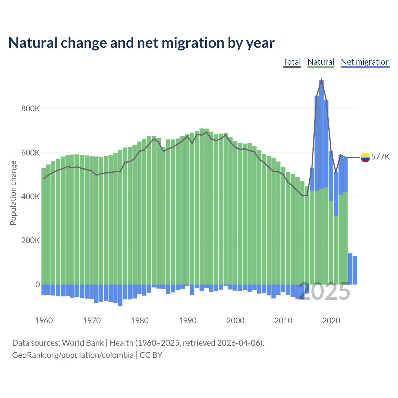 Over the last 10 years, 66.6% of the population change in Colombia is from natural causes (a gain of 4,162,856 people) and 33.4% is from migration (a gain of 2,083,051 people).