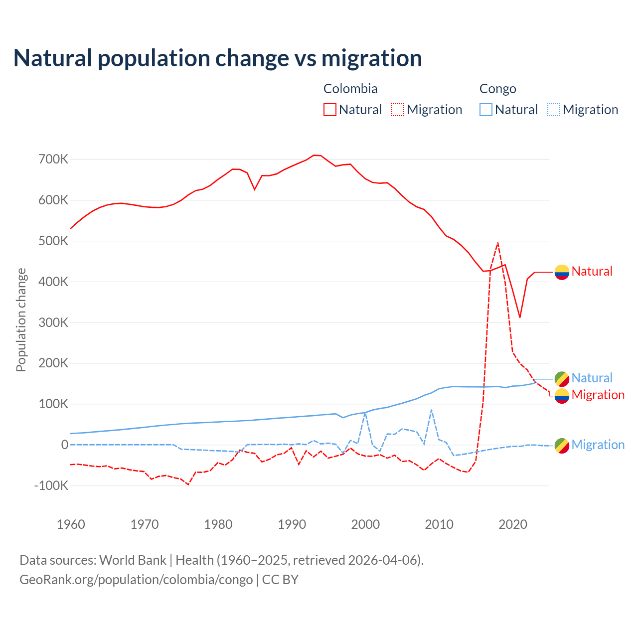 Over the last 10 years, 66.6% of the population change in Colombia is from natural causes (a gain of 4,162,856 people) and 33.4% is from migration (a gain of 2,083,051 people). In the Congo 94% is from natural causes (a gain of 1,434,056 people) and 6.04% is from migration (a loss of 92,251 people).