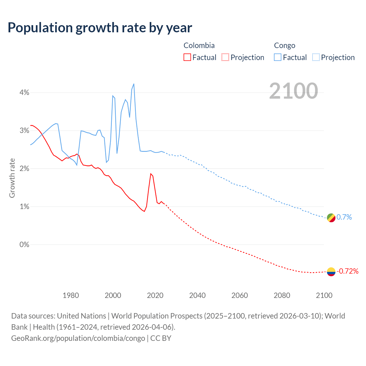 - For the last 10 years, Colombia has had an average growth rate of +1.25% per year vs +2.44% in the Congo.