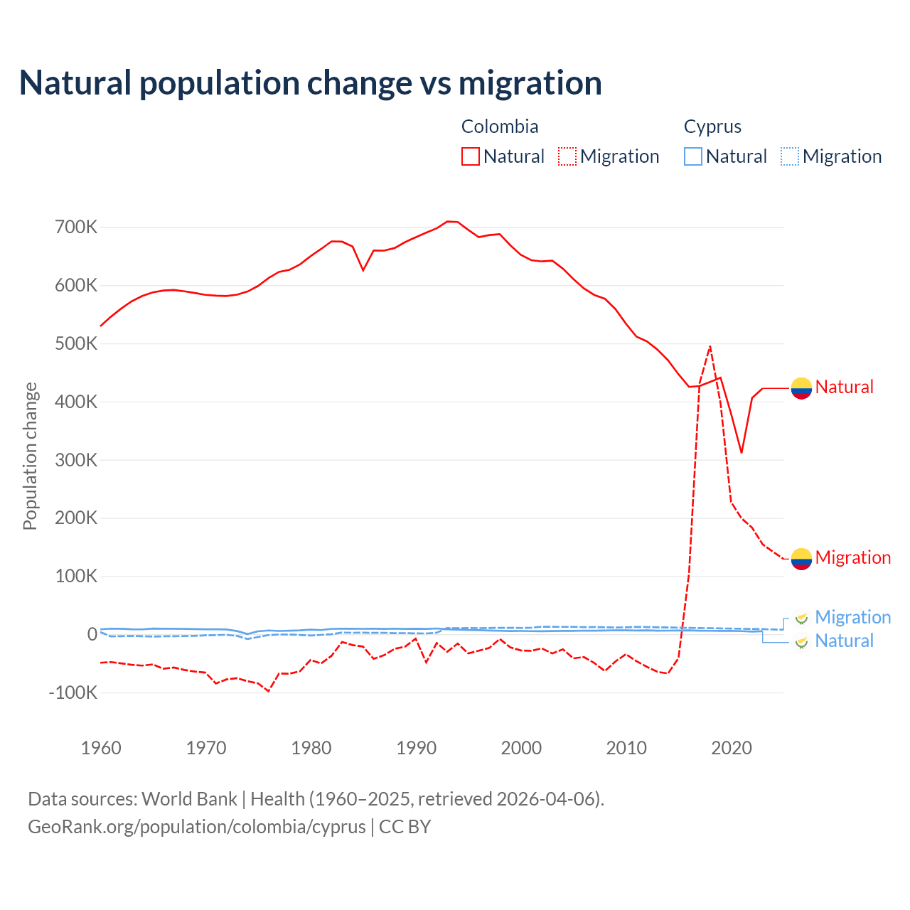 Over the last 10 years, 66.6% of the population change in Colombia is from natural causes (a gain of 4,162,856 people) and 33.4% is from migration (a gain of 2,083,051 people). In Cyprus 36.2% is from natural causes (a gain of 57,464 people) and 63.8% is from migration (a gain of 101,458 people).