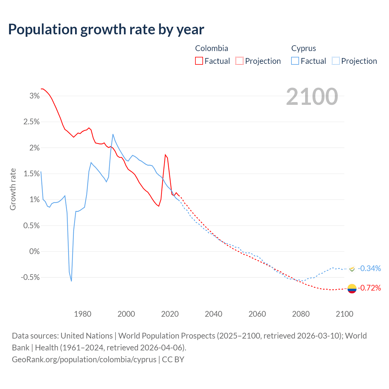 - For the last 10 years, Colombia has had an average growth rate of +1.25% per year vs +1.26% in Cyprus.