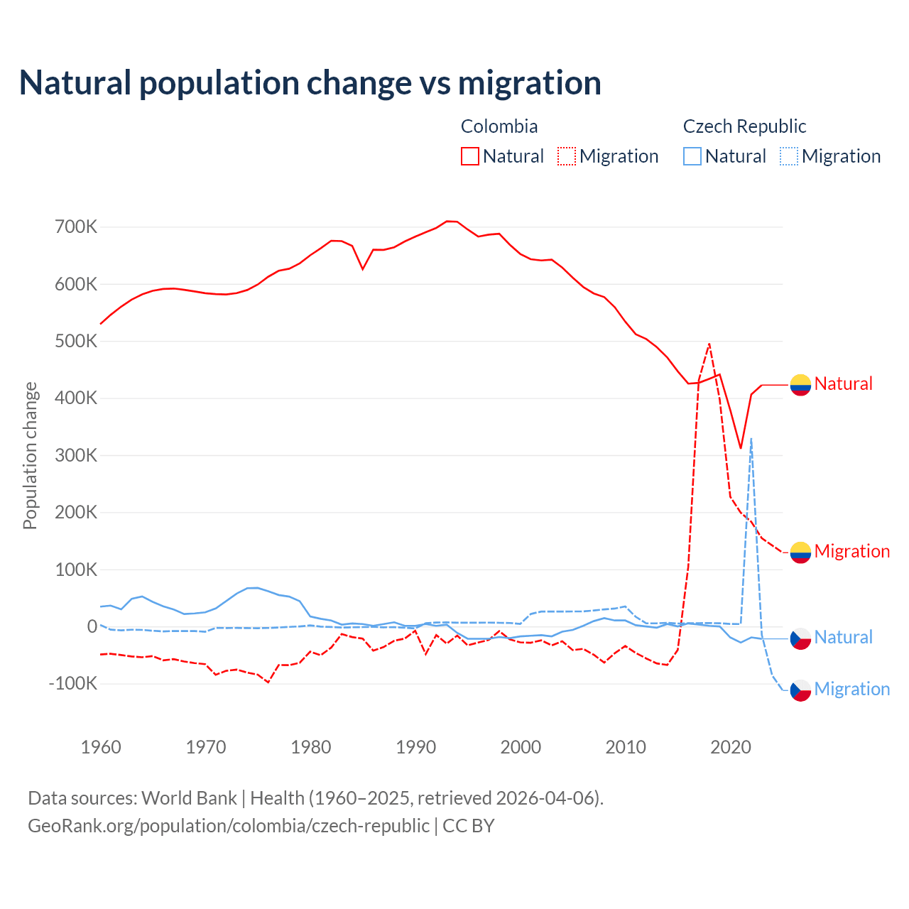 Over the last 10 years, 66.6% of the population change in Colombia is from natural causes (a gain of 4,162,856 people) and 33.4% is from migration (a gain of 2,083,051 people). In the Czech Republic 17.3% is from natural causes (a loss of 74,826 people) and 82.7% is from migration (a gain of 357,502 people).