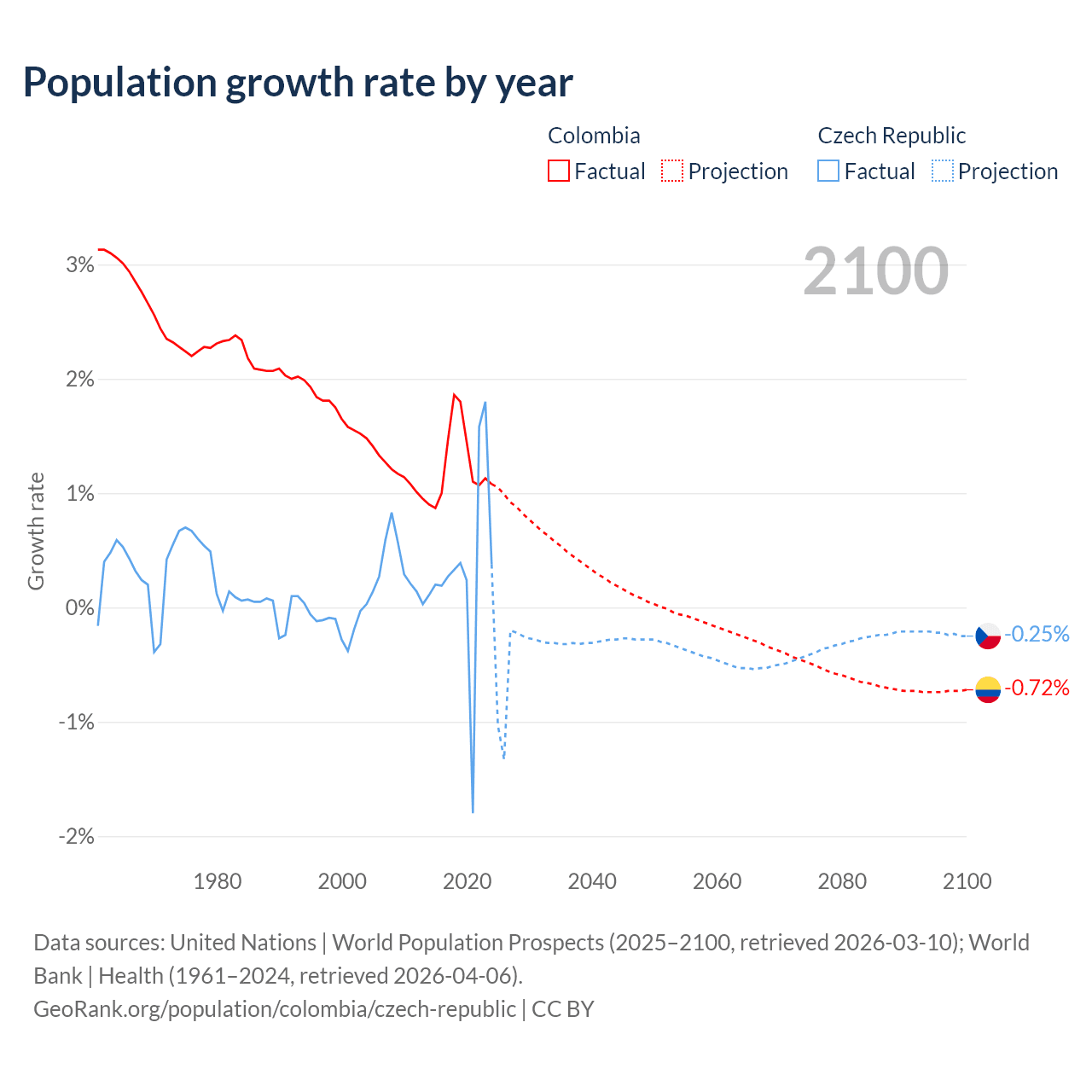 - For the last 10 years, Colombia has had an average growth rate of +1.25% per year vs +0.34% in the Czech Republic.