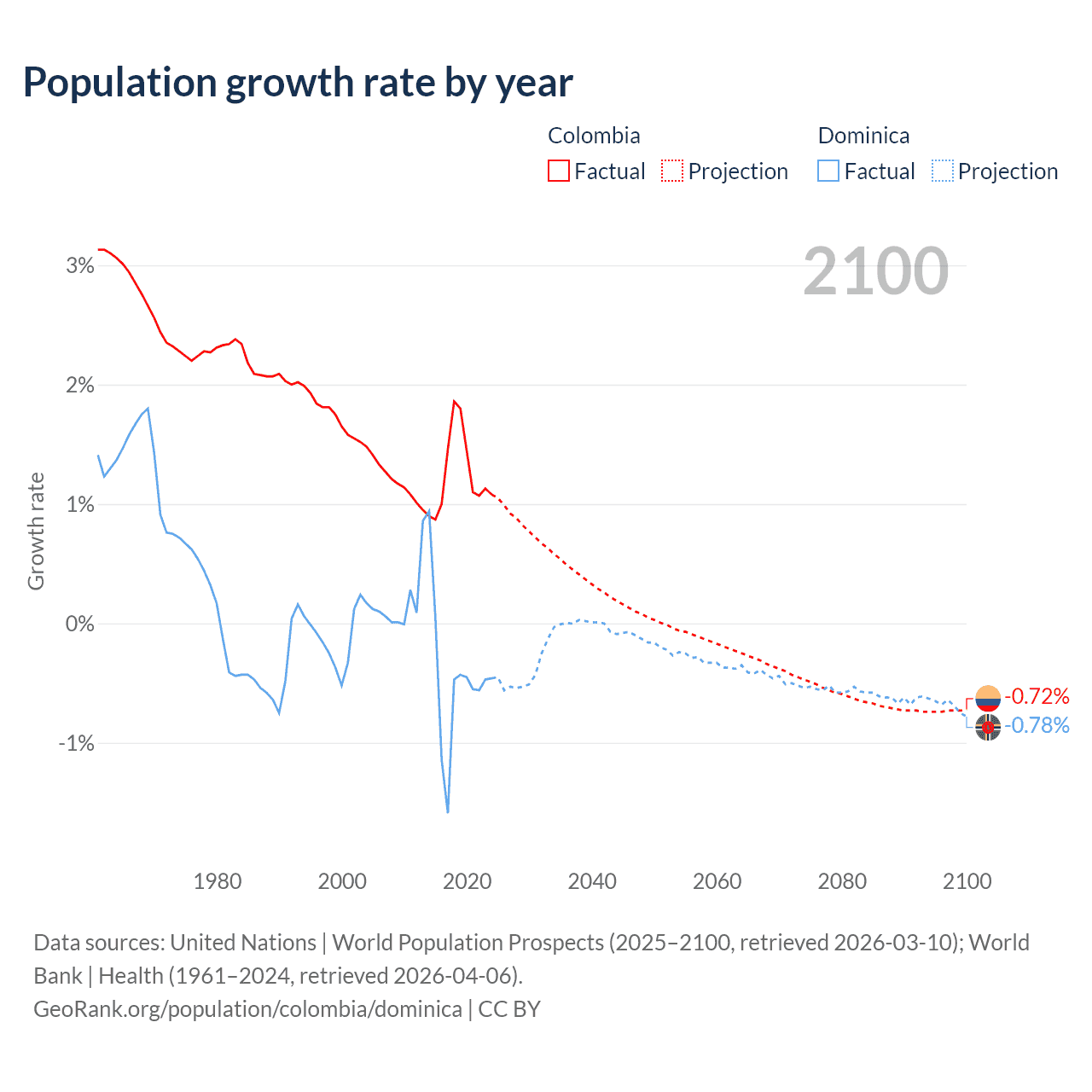 - For the last 10 years, Colombia has had an average growth rate of +1.25% per year vs -0.47% in Dominica.