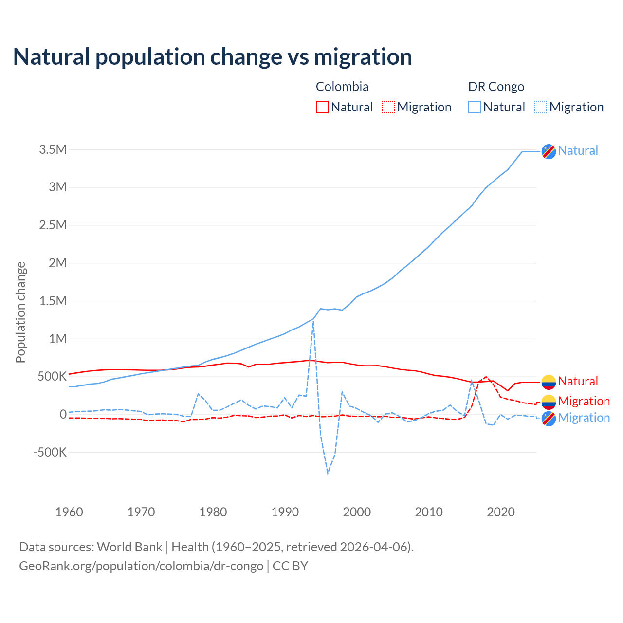 Over the last 10 years, 66.6% of the population change in Colombia is from natural causes (a gain of 4,162,856 people) and 33.4% is from migration (a gain of 2,083,051 people). In the DR Congo 99.1% is from natural causes (a gain of 30,150,516 people) and 0.89% is from migration (a gain of 270,872 people).