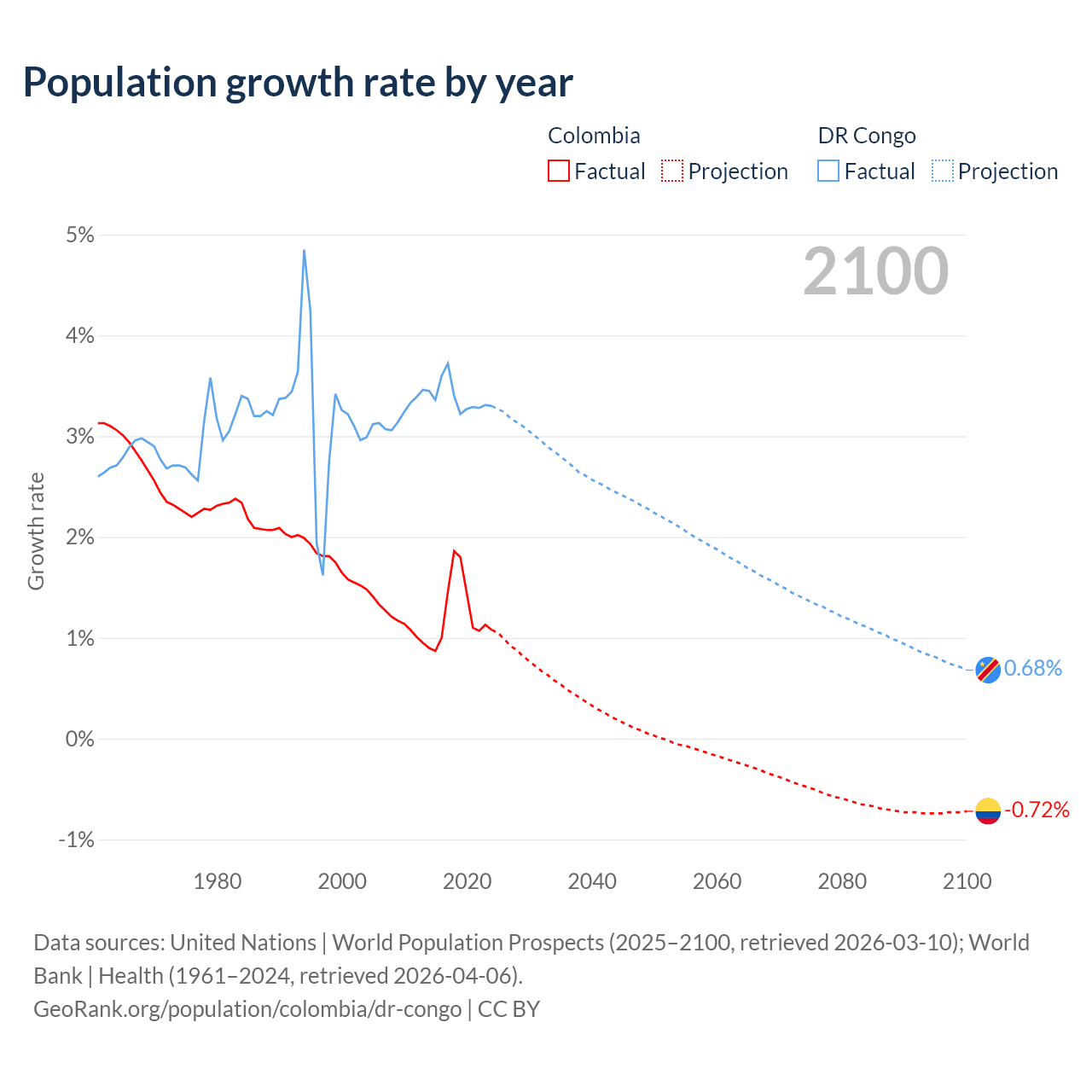 - For the last 10 years, Colombia has had an average growth rate of +1.25% per year vs +3.38% in the DR Congo.