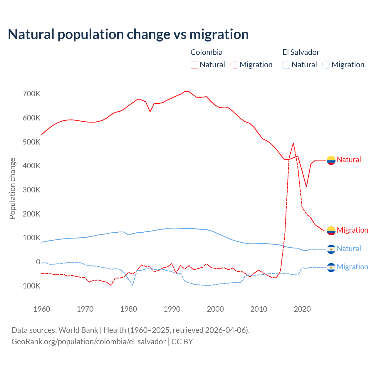Over the last 10 years, 66.6% of the population change in Colombia is from natural causes (a gain of 4,162,856 people) and 33.4% is from migration (a gain of 2,083,051 people). In El Salvador 58.8% is from natural causes (a gain of 579,641 people) and 41.2% is from migration (a loss of 406,874 people).
