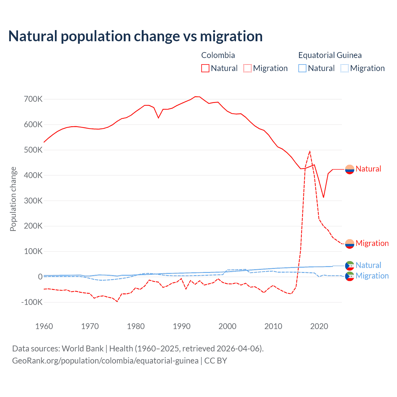 Over the last 10 years, 66.6% of the population change in Colombia is from natural causes (a gain of 4,162,856 people) and 33.4% is from migration (a gain of 2,083,051 people). In Equatorial Guinea 77% is from natural causes (a gain of 382,745 people) and 23% is from migration (a gain of 114,024 people).