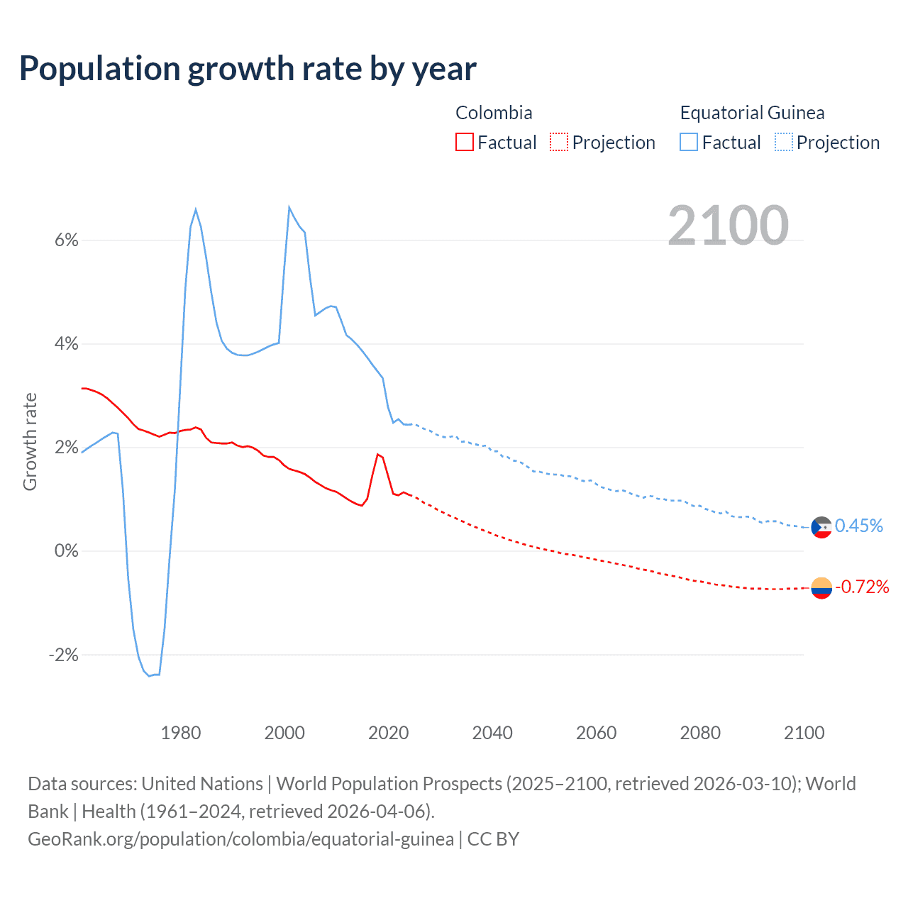 - For the last 10 years, Colombia has had an average growth rate of +1.25% per year vs +3.15% in Equatorial Guinea.