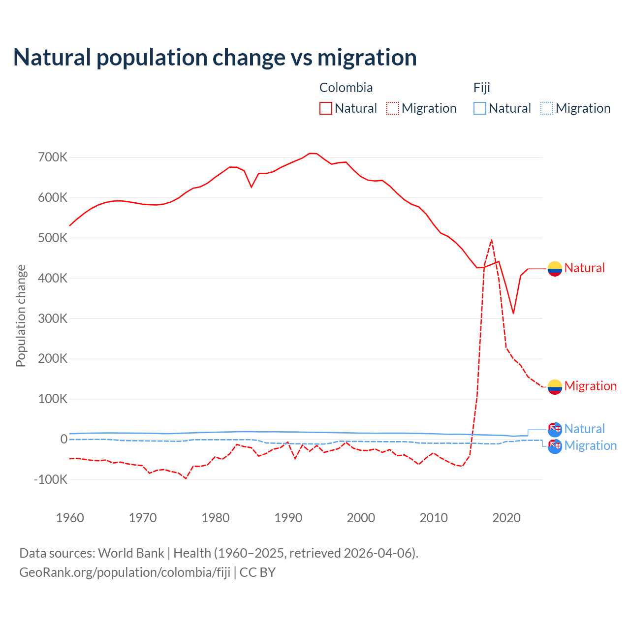 Over the last 10 years, 66.6% of the population change in Colombia is from natural causes (a gain of 4,162,856 people) and 33.4% is from migration (a gain of 2,083,051 people). In Fiji 52.6% is from natural causes (a gain of 94,971 people) and 47.4% is from migration (a loss of 85,415 people).