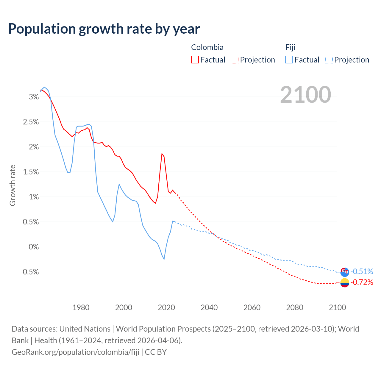- For the last 10 years, Colombia has had an average growth rate of +1.25% per year vs +0.12% in Fiji.