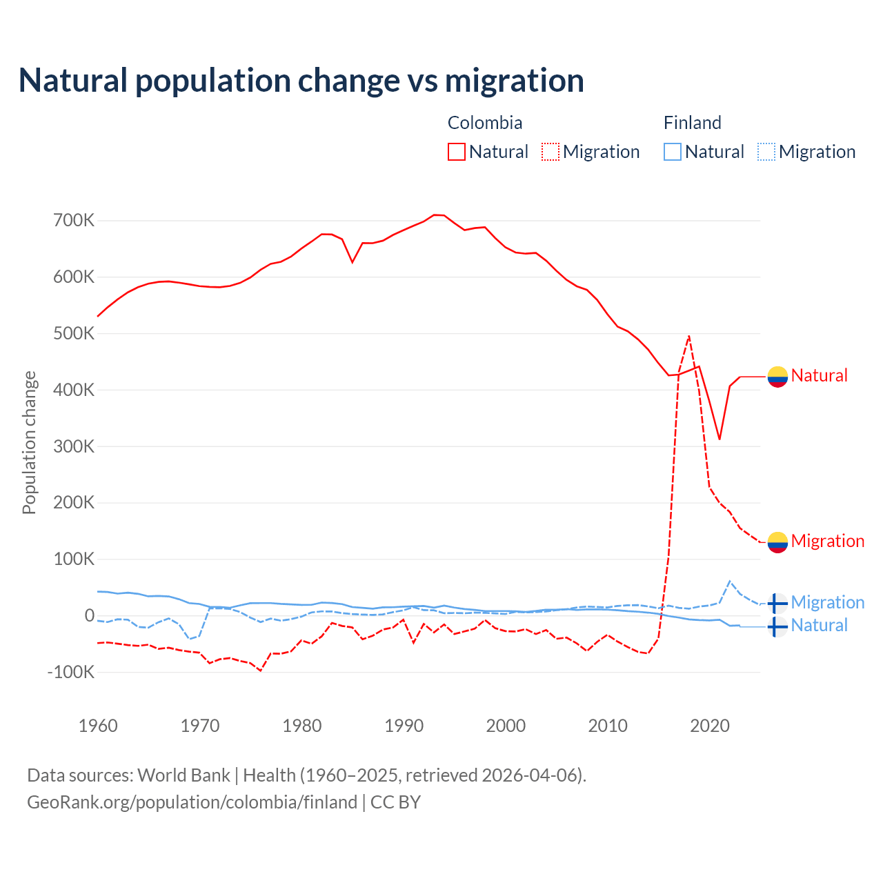 Over the last 10 years, 66.6% of the population change in Colombia is from natural causes (a gain of 4,162,856 people) and 33.4% is from migration (a gain of 2,083,051 people). In Finland 22.5% is from natural causes (a loss of 65,560 people) and 77.5% is from migration (a gain of 225,237 people).