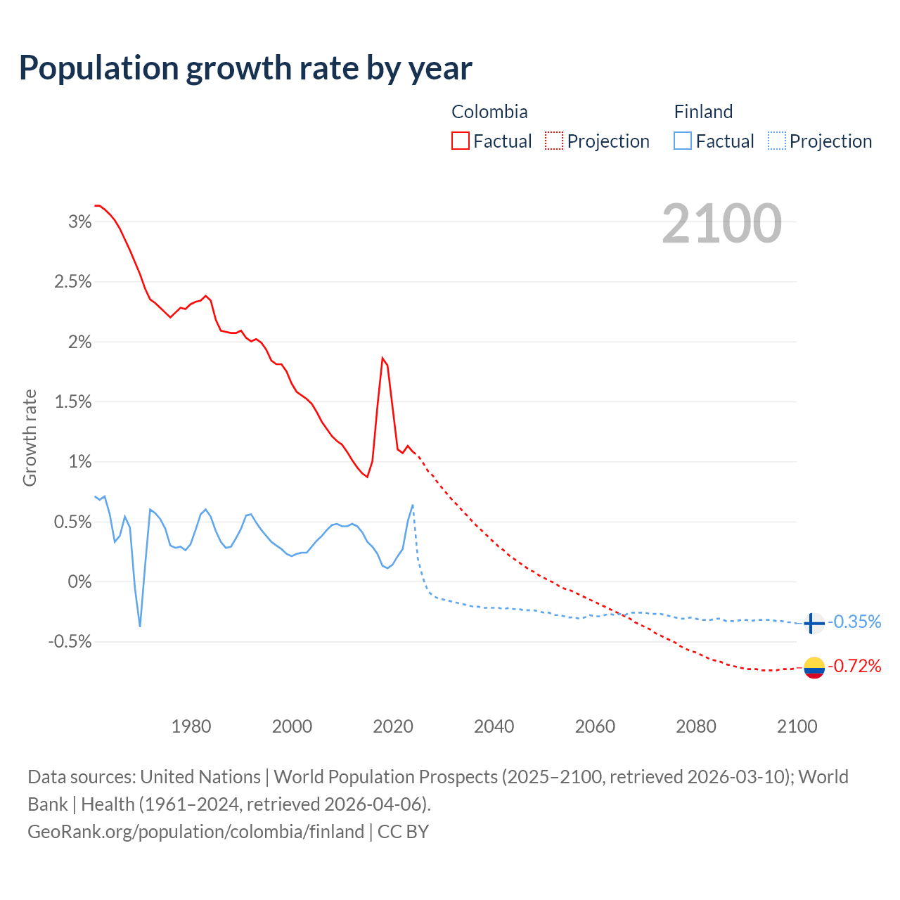 - For the last 10 years, Colombia has had an average growth rate of +1.25% per year vs +0.3% in Finland.