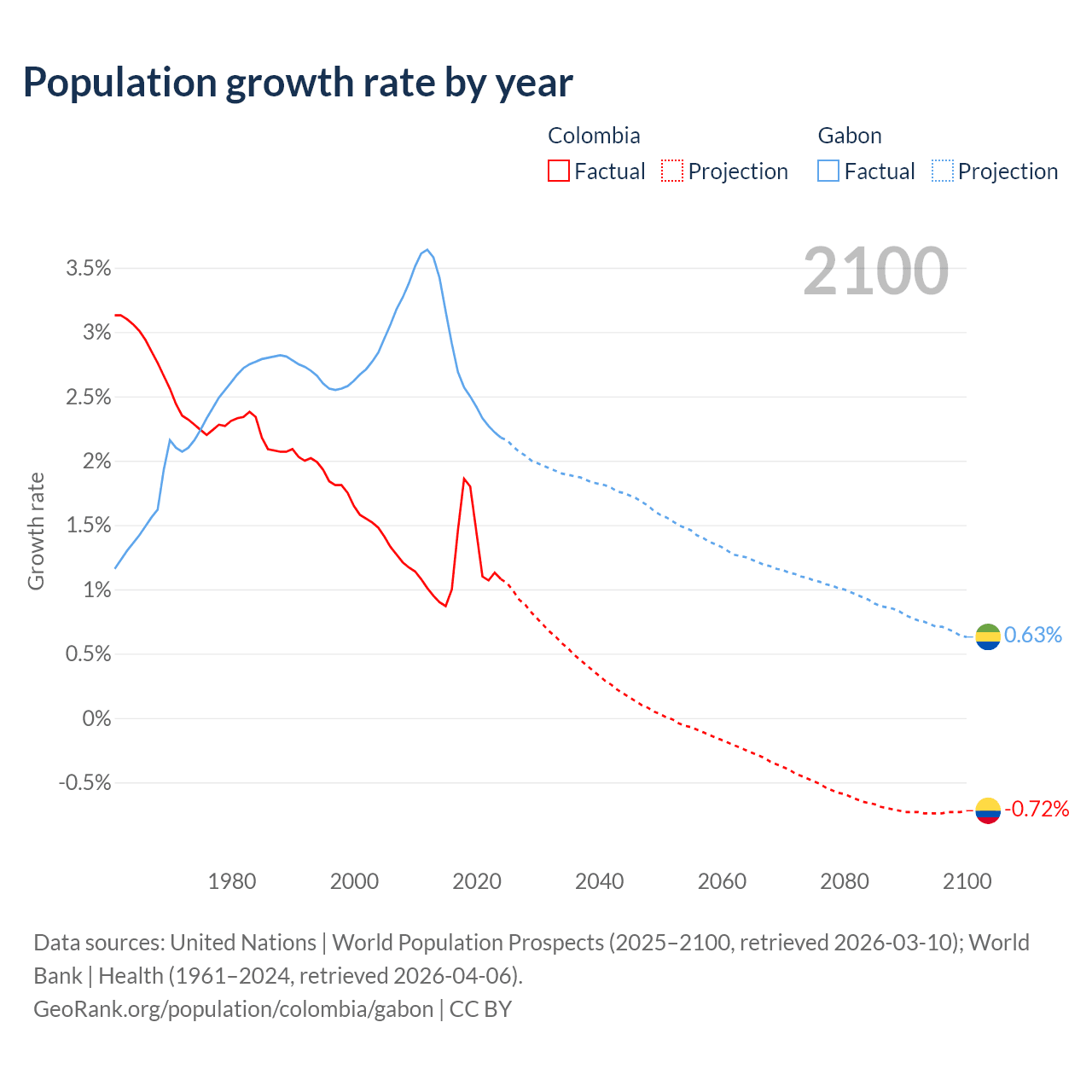 - For the last 10 years, Colombia has had an average growth rate of +1.25% per year vs +2.61% in Gabon.