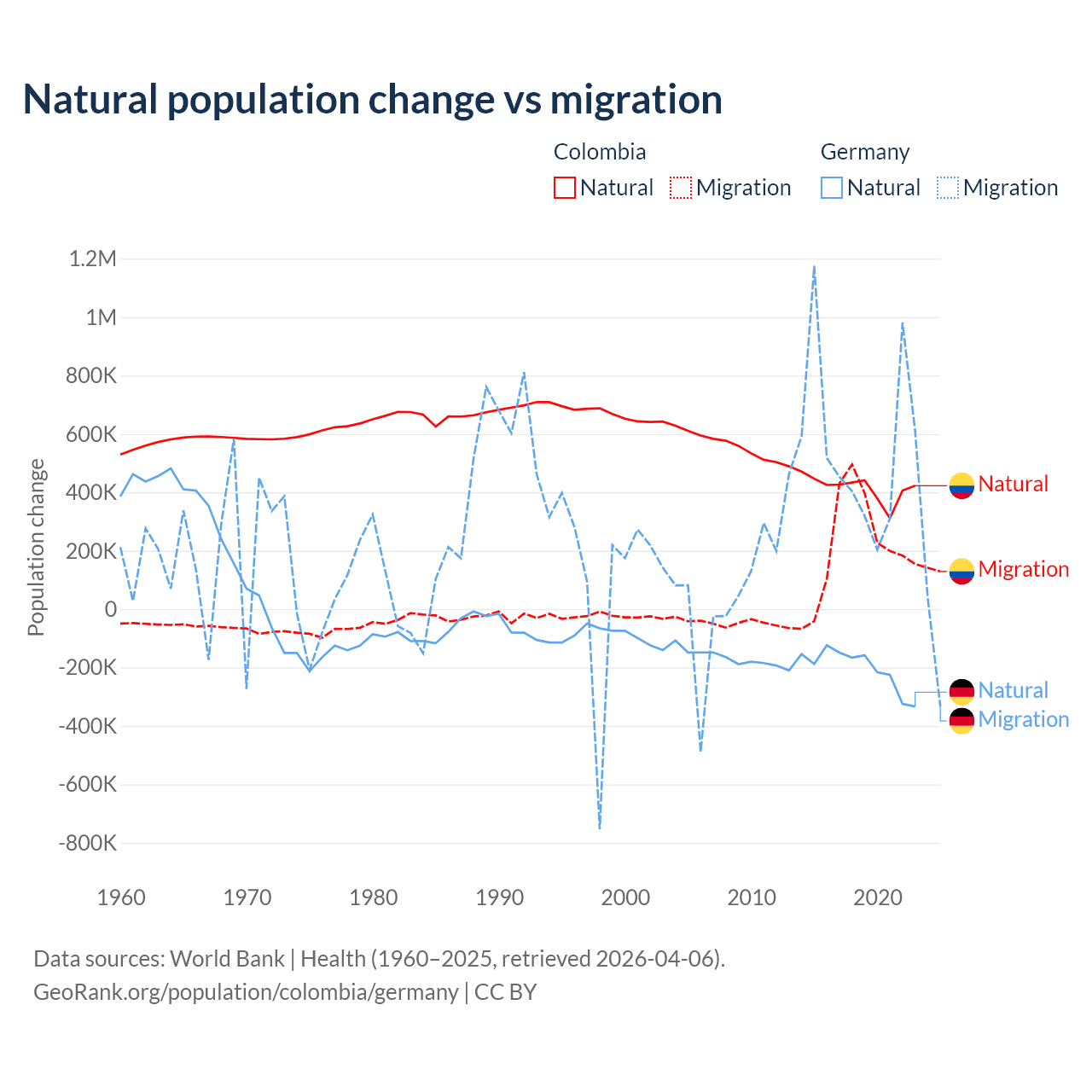 Over the last 10 years, 66.6% of the population change in Colombia is from natural causes (a gain of 4,162,856 people) and 33.4% is from migration (a gain of 2,083,051 people). In Germany 26.8% is from natural causes (a loss of 2,036,130 people) and 73.2% is from migration (a gain of 5,565,916 people).