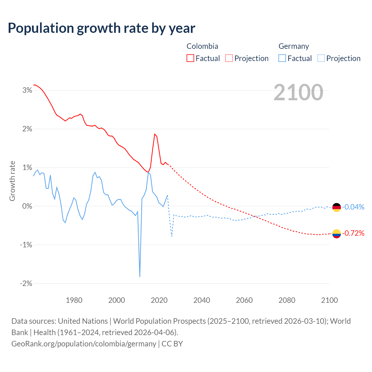- For the last 10 years, Colombia has had an average growth rate of +1.25% per year vs +0.32% in Germany.