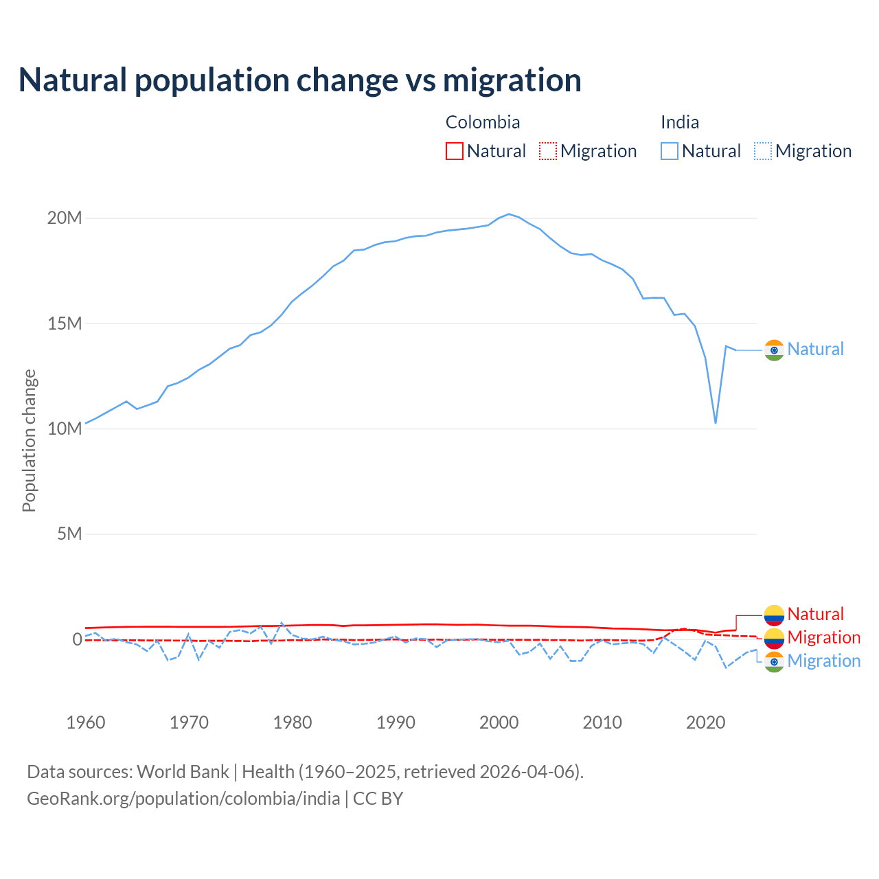 Over the last 10 years, 66.6% of the population change in Colombia is from natural causes (a gain of 4,162,856 people) and 33.4% is from migration (a gain of 2,083,051 people). In India 96.4% is from natural causes (a gain of 145,503,378 people) and 3.56% is from migration (a loss of 5,376,884 people).